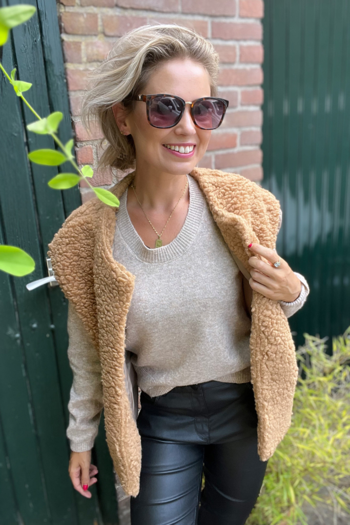 Onze lichtbruine teddy gilet is dé musthave van dit seizoen. Niet alleen is hij heerlijk warm, hij ziet er ook nog eens super stijlvol uit. Perfect om over een trui of blouse te dragen en elke outfit meteen een cozy-chic uitstraling te geven. Ideaal voor herfstwandelingen of een dagje in de stad: met deze gilet zit je altijd goed!
