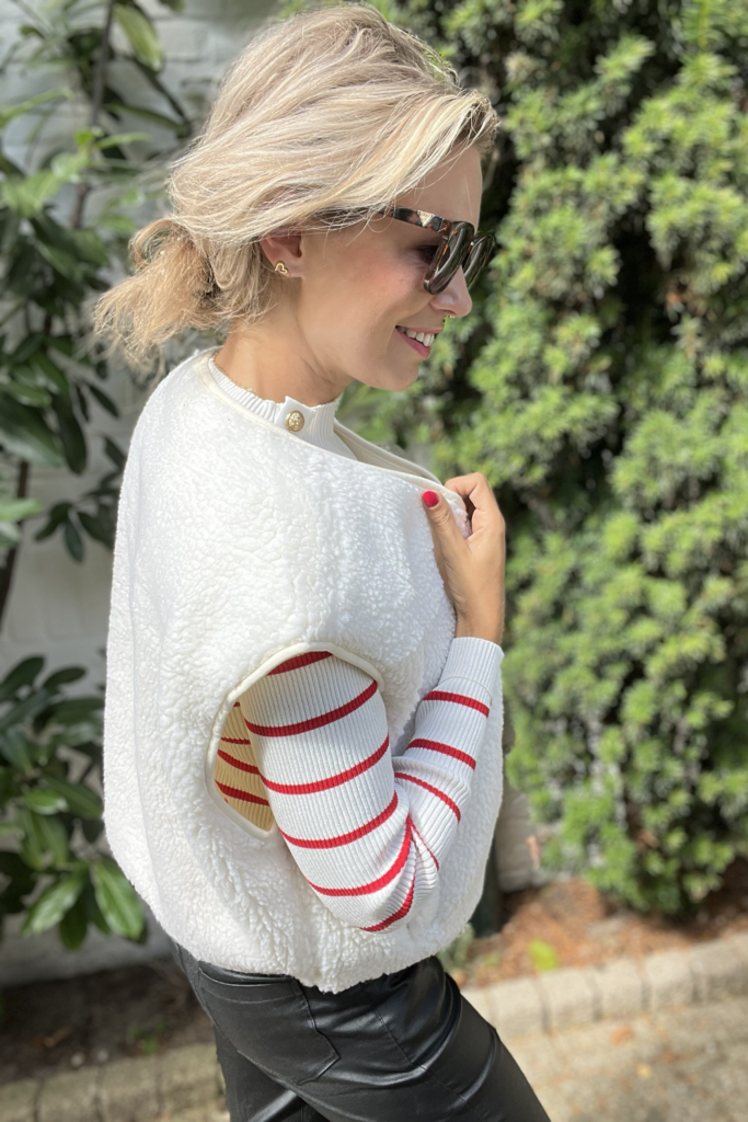 Onze off-white teddy gilet is zacht, warm én stijlvol tegelijk. Perfect om over een casual outfit te dragen, bijvoorbeeld met een streepjestrui of gestreepte top: een combinatie die meteen een speelse en trendy twist geeft aan je look! Met deze gilet blijf je lekker warm én modieus tijdens de frisse herfstdagen.